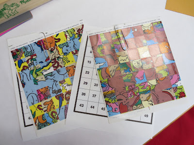 My son drew the dinosaurs and I cut out the holes. Then we painted the dinosaurs.